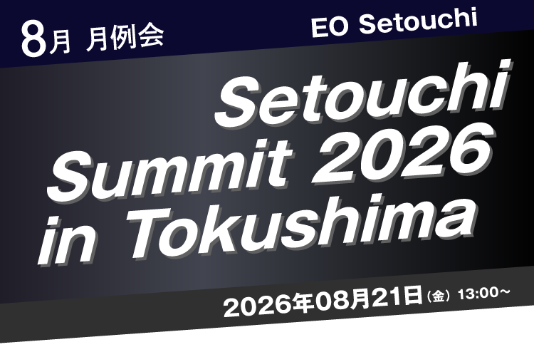 2026.03.05 お知らせ EO Setouchi 3月月例会&オープンイベント@岡山 2026.02.11 お知らせ (EOIBSアクセラシステム)Next Vision Retreat ~富士山麓で思考を研ぎ澄ます3日間~ 2025.11.19 お知らせ EO Setouchi オープンイベント@香川 MORE 会長メッセージ 理事紹介 歴代会長 Memberメンバー紹介 会長 鈴江 崇文徳島県 株式会社GreenEnergy & Company https://green-energy.co.jp/ Membership/副会長 太田 恵理子徳島県 株式会社 ハビリテ https://yuzu-reha.jp/ Membership 井上 光徳島県 株式会社阿波和 https://awawaland.co.jp/ Member Engagement 坂元 陽祐高知県 株式会社インフラマネジメント https://infra-m.co.jp/ Forum 三木 義和徳島県 株式会社情熱カンパニー https://www.jonetsu-company.com/ Learning 吉田 宏愛媛県 株式会社アート不動産 https://www.7300.co.jp/ Marketing&Com 松井 保島根県 株式会社日本ワイドコミュニケーションズ https://www.n-wide.co.jp/ MyEO/IB 須江 勇介高知県 株式会社アッシェ https://ashe.co.jp/ Strategic Alliances 淵上 優広島県 DAOBASE株式会社 https://daobase.jp/ Accelerator/Mentorship 山本準也愛媛県 株式会社Noah https://noah-inc.jp/ Accelerator/Mentorship 増本 良介岡山県 株式会社ULC https://carshop-m.com/ Accelerator/Mentorship 岡崎 純也広島県 株式会社FAMZ https://famz.letgroup.net/ Finance/Member Engagement 高橋 秀典愛媛県 株式会社 日昇 https://www.nissho.ehime.jp/ GSEA 佐藤 友彦広島県 4FUL株式会社 https://www.satosangyo.com/ Governance 吉村 紀行愛媛県 弁護士法人たいよう https://www.taiyo-lawoffice.com/ MORE Global Theme for FY25/26 DO HARD THINGS Setouchi Theme Setouchi Accelerator Latest Data 会員人数・総売上・従業員数 (2025年7月1日時点) 会員数 52名 売上高中央値 3.4億円 総従業員数 11,016名 Forumフォーラム 信頼のおける創業経営者仲間からの 「経験シェアリング」による気づきや、 学びを成長に繋げていく、 EOにおいての最も価値ある活動の一つです。 Monthly Meeting月例会&ラーニングイベント 月に一度、月例会を開催し メンバー同士の交流と成長を 支援しています。 My EOMy EO EOにおける自身の経験をベースに、メンバーがより能動的にメンバーシップの価値を最大限化させるために誕生したメンバーのためのプラットフォームです。 Acceleratorアクセラレータープログラム EOならではのプログラムや ネットワークを活かした 総合支援を行っています。 Global Activityグローバルアクティビティ Once in a Lifetime Experience(一生に一度の経験)をコンセプトとしたEOでしかできない刺激的な体験学習、世界に広がるネットワークを活かした支援を行っています。 Supporting Member賛助会員